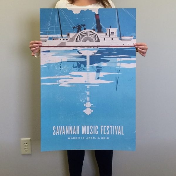 The image of this season’s poster illustration draws inspiration from the festival’s host city’s proximity to the Savannah River, one of Georgia’s longest and largest waterways and a shipping channel for the Port of Savannah, the nation’s tenth-busiest port for oceangoing container ships. Pictured is a paddle steamer bringing the music into Savannah with the reflections showing a banjo emanating from the wheelhouse.