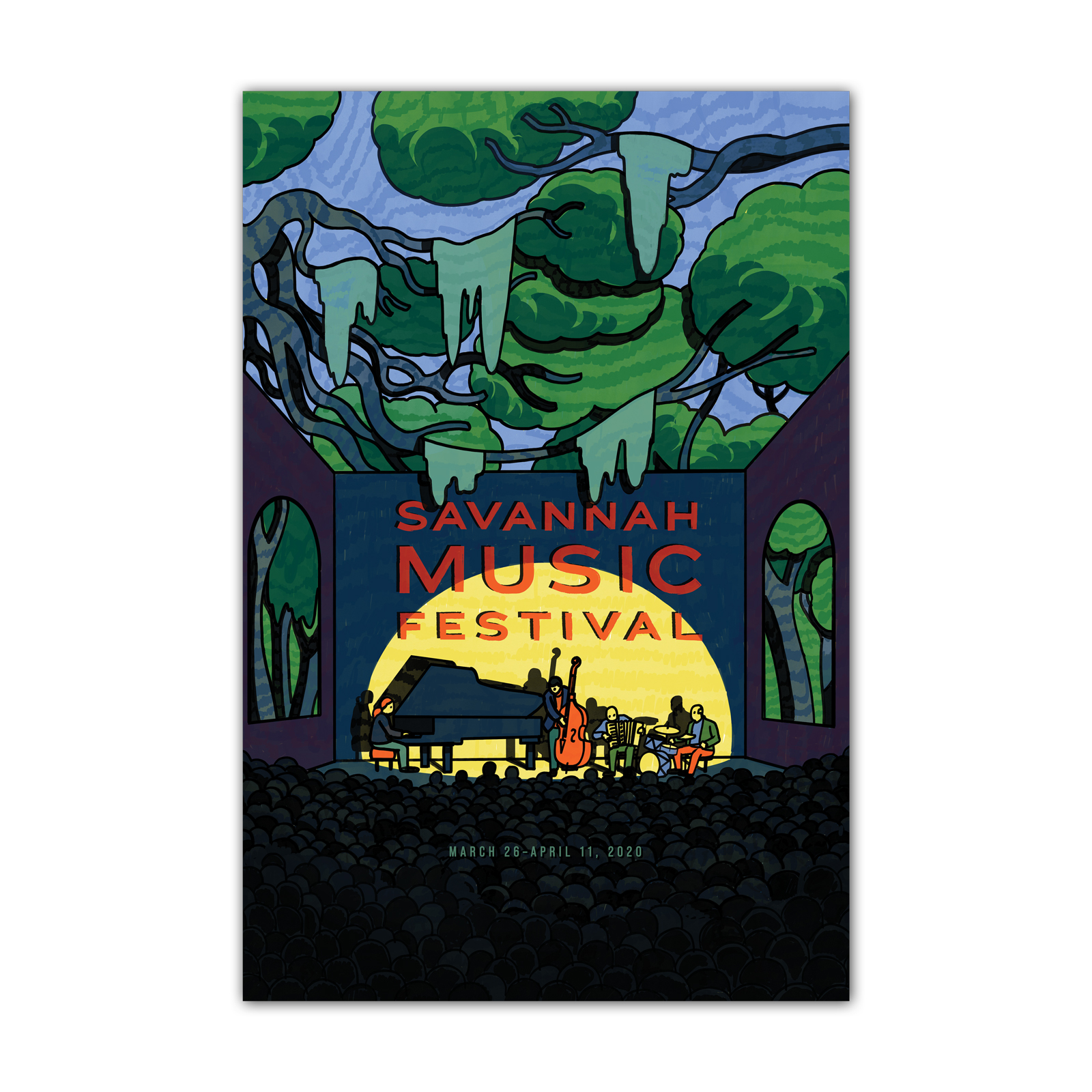For the 2020 season poster, the Savannah Music Festival commissioned illustrator Klaus Kremmerz. Kremmerz works for several international clients such as New Yorker, New York Times, Vanity fair, Esquire, IBM, GQ and many more. He lives here and there, traveling the globe and working on his laptop. After a trip to the Savannah Music Festival, Kremmerz fell in love with Savannah’s beautiful trees, nature, and architecture. About the inspiration behind the image, he says “Savannah struck me as a storytelling kind of place. I tried to put everything I experienced and everything that impressed me about its beauty and atmosphere in this image. It is my hope that my feelings come across in this illustration.”