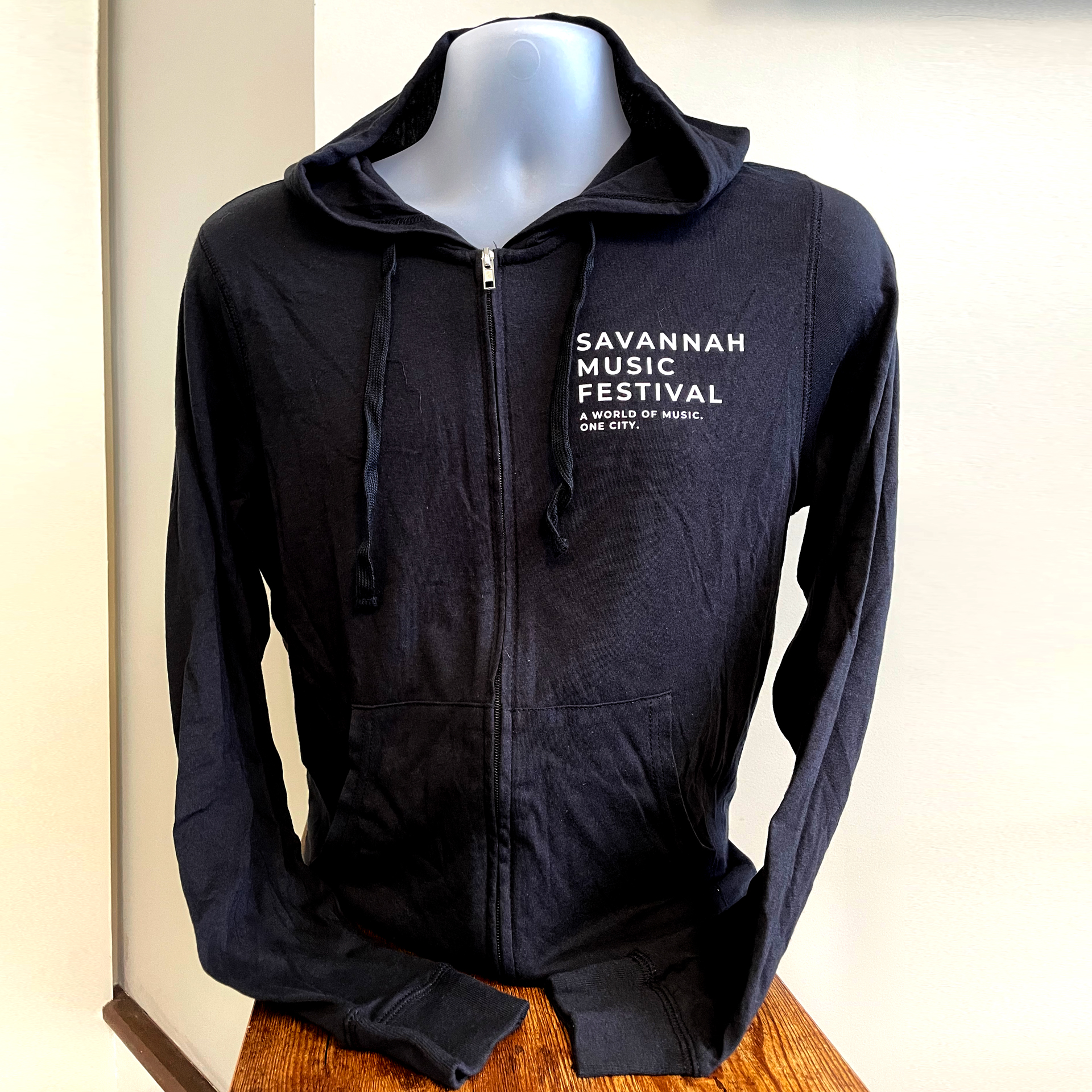 This lightweight go-to unisex zip-up hoodie with a modern fit features a white imprint on the left chest, front zipper, and kangaroo pocket.
