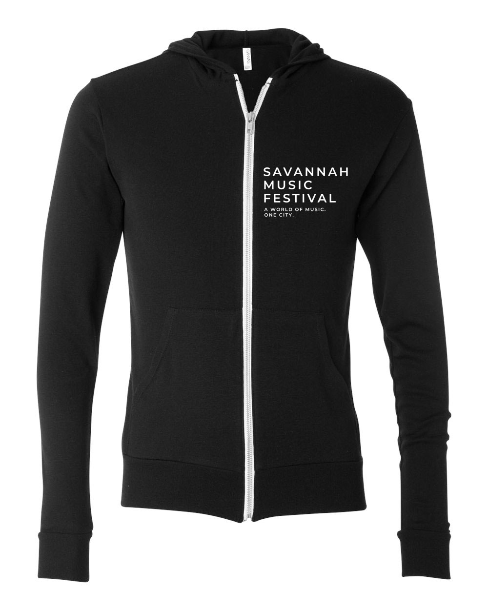This lightweight go-to unisex zip-up hoodie with a modern fit features a white imprint on the left chest, front zipper, and kangaroo pocket.